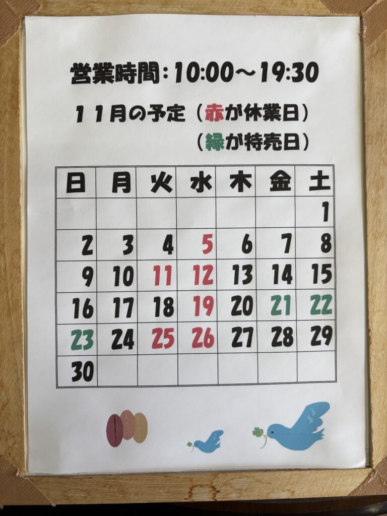 特売日はコーヒー豆15%OFF(一部除外品あり)、ココアやコーヒーピーナッツなどのその他商品も10%OFFとなります。